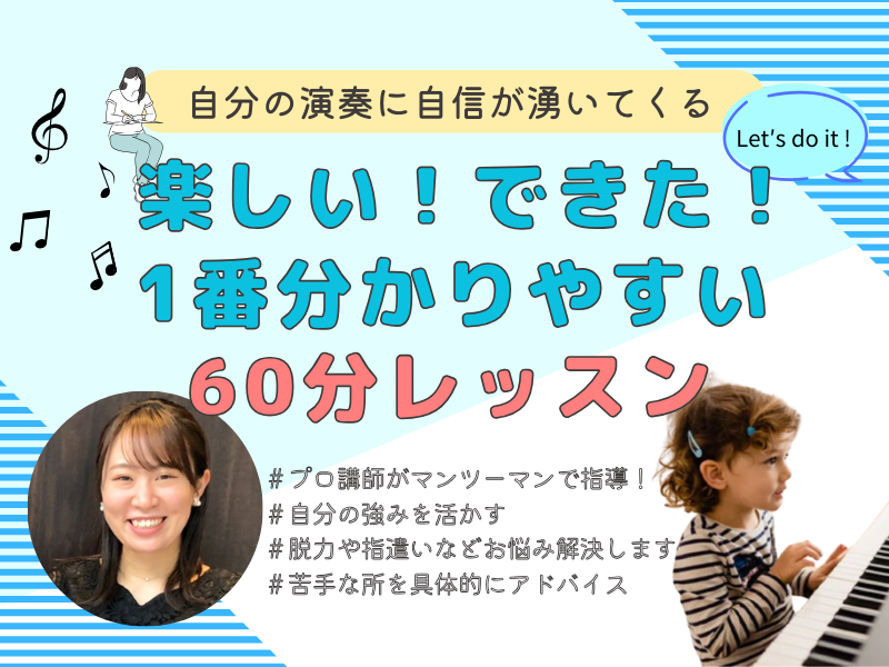 (昔習っていた基礎を大切にしつつ、大人の今だからこそわかる音楽の深さや楽しさを、60分間じっくりと堪能したい方を全力でサポートします。)